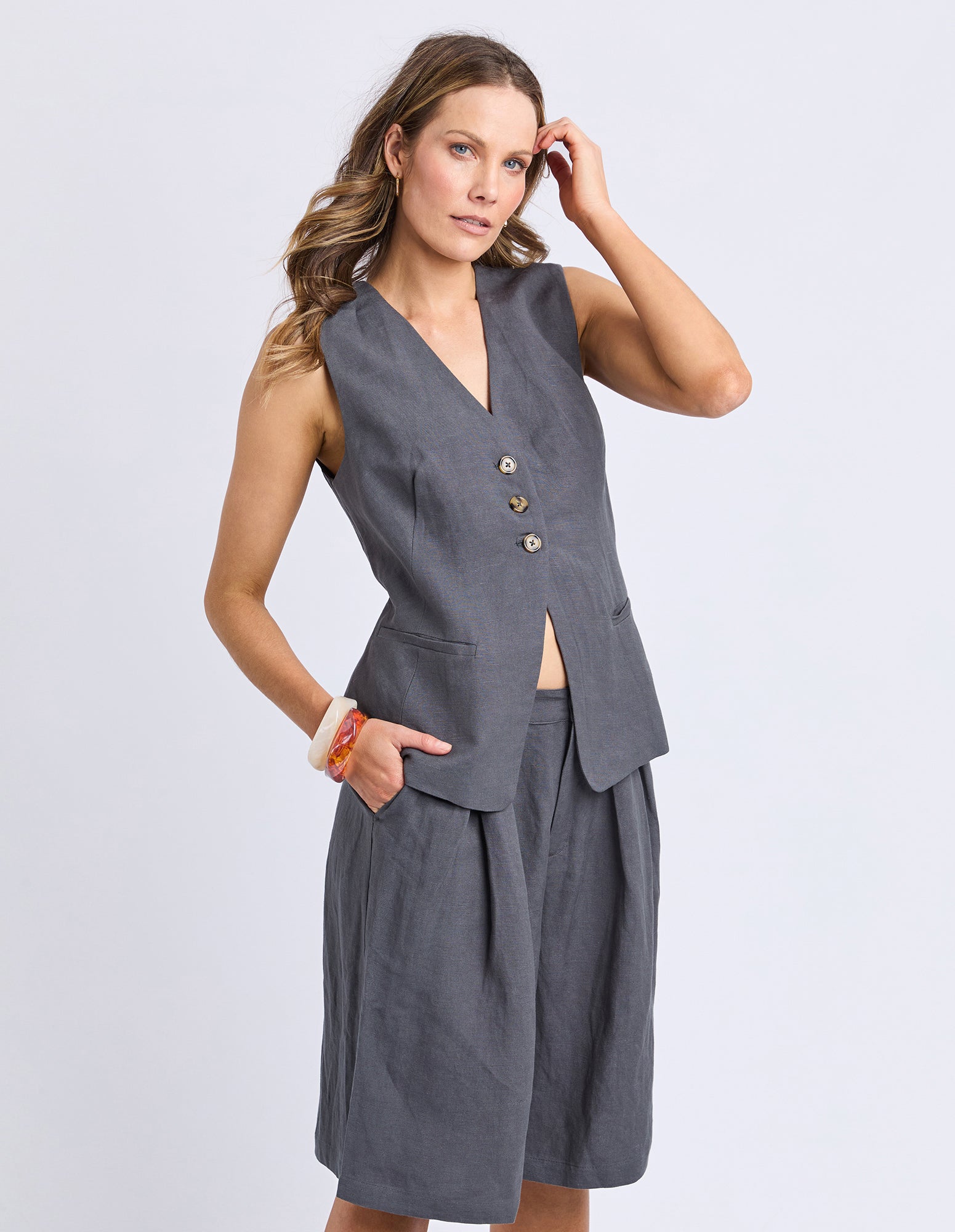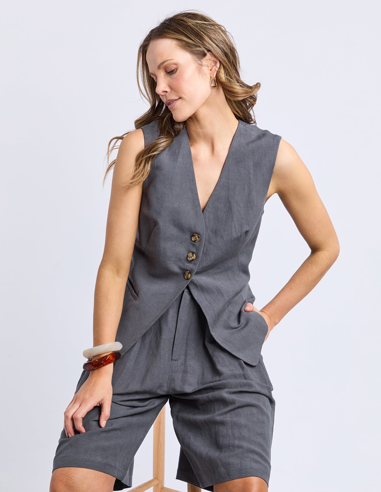 Add a touch of laid-back cool with the Peyton Vest. Crafted from a breezy linen blend, it features a flattering V neckline, three front buttons, and chic faux pockets for effortless style. Perfect for layering and taking your look to the next level.