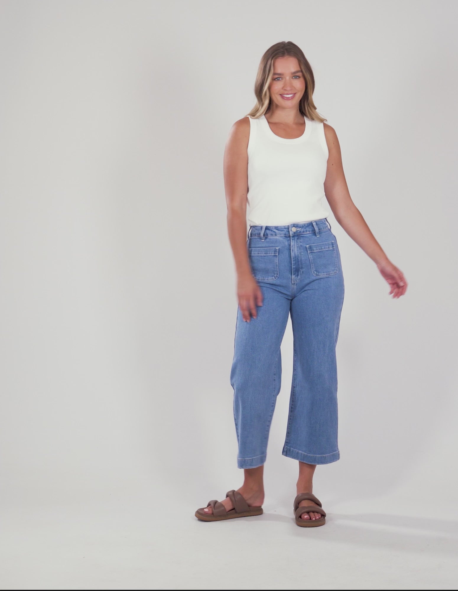 Our best-selling Sarah just got cropped! Featuring a wide leg, high rise, and front pockets, these stretch denim jeans are made for effortless cool and all-day comfort. The perfect pair to add some fresh vibes to your denim collection.