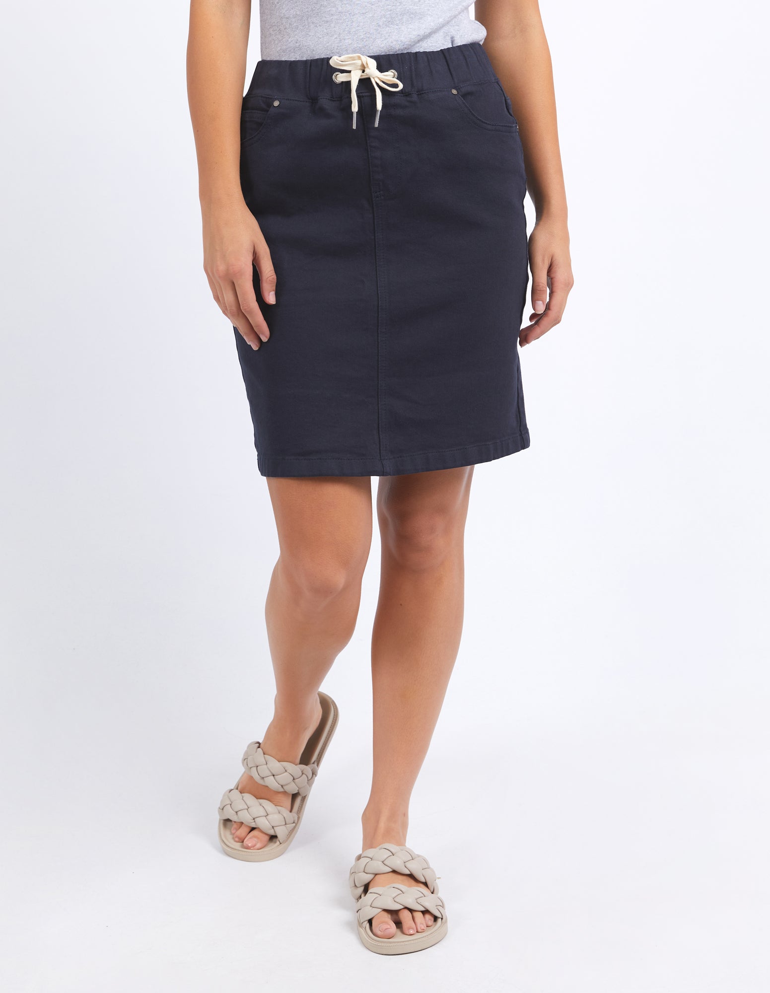 Comfort and style with this little denim skirt. With a super stretchy fit and draw cord for cinching in at the waist, this is the best little denim skirt you'll ever wear!