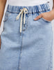 Comfort and style with this little denim skirt. With a super stretchy fit and draw cord for cinching in at the waist, this is the best little denim skirt you'll ever wear!
