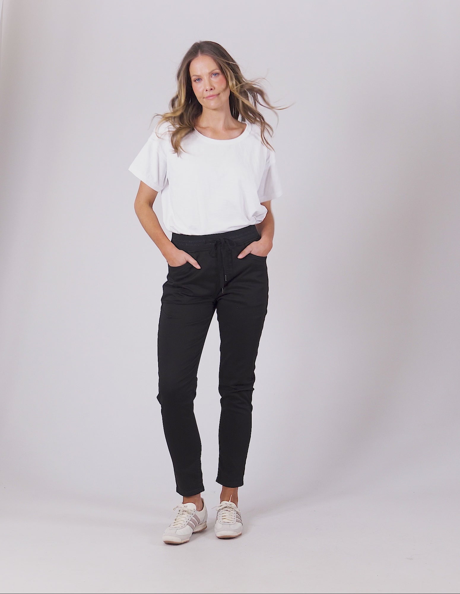 The Sylvia Jogger is a comfy pair of relaxed pants. Constructed from a super soft, two-way stretch cotton drill in a midweight fabric with 2 side pockets, 2 back pockets and an elastic waistline with soft drawstring