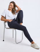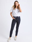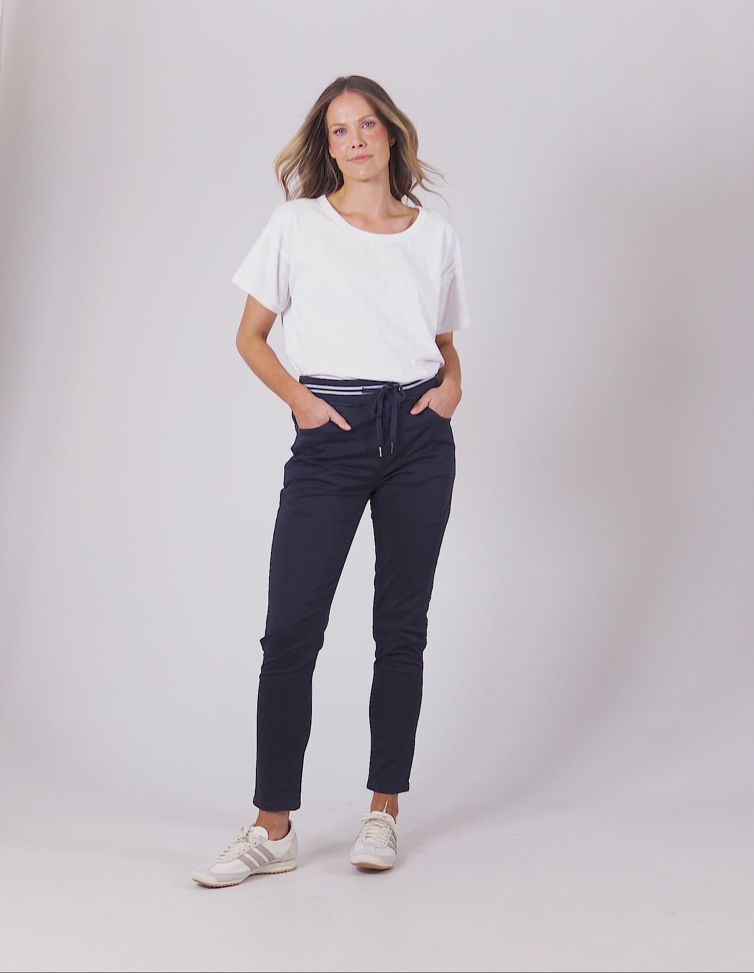 Comfortable and relaxed the Sylvia Jogger is constructed from a super soft two-way stretch cotton drill in a midweight fabric, these pants feature 2 side pockets, 2 back pockets, and an elastic waistline with a soft drawstring. Ideal for casual wear all day, every day.