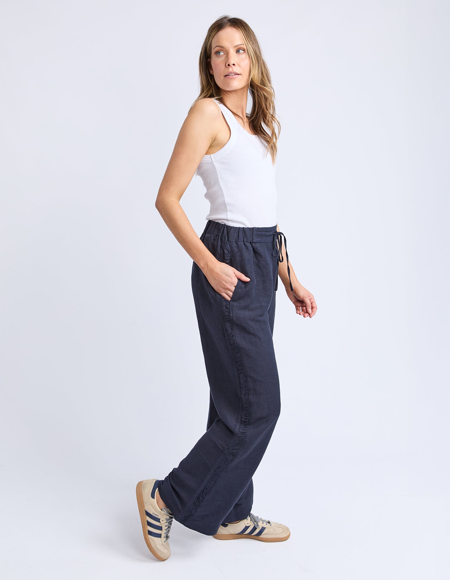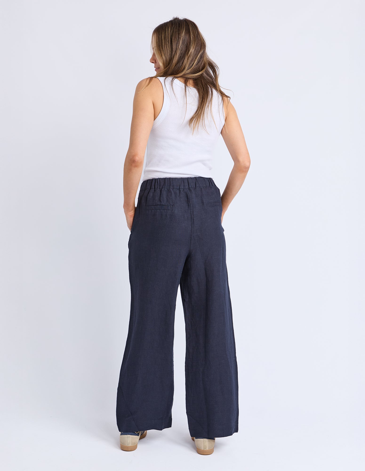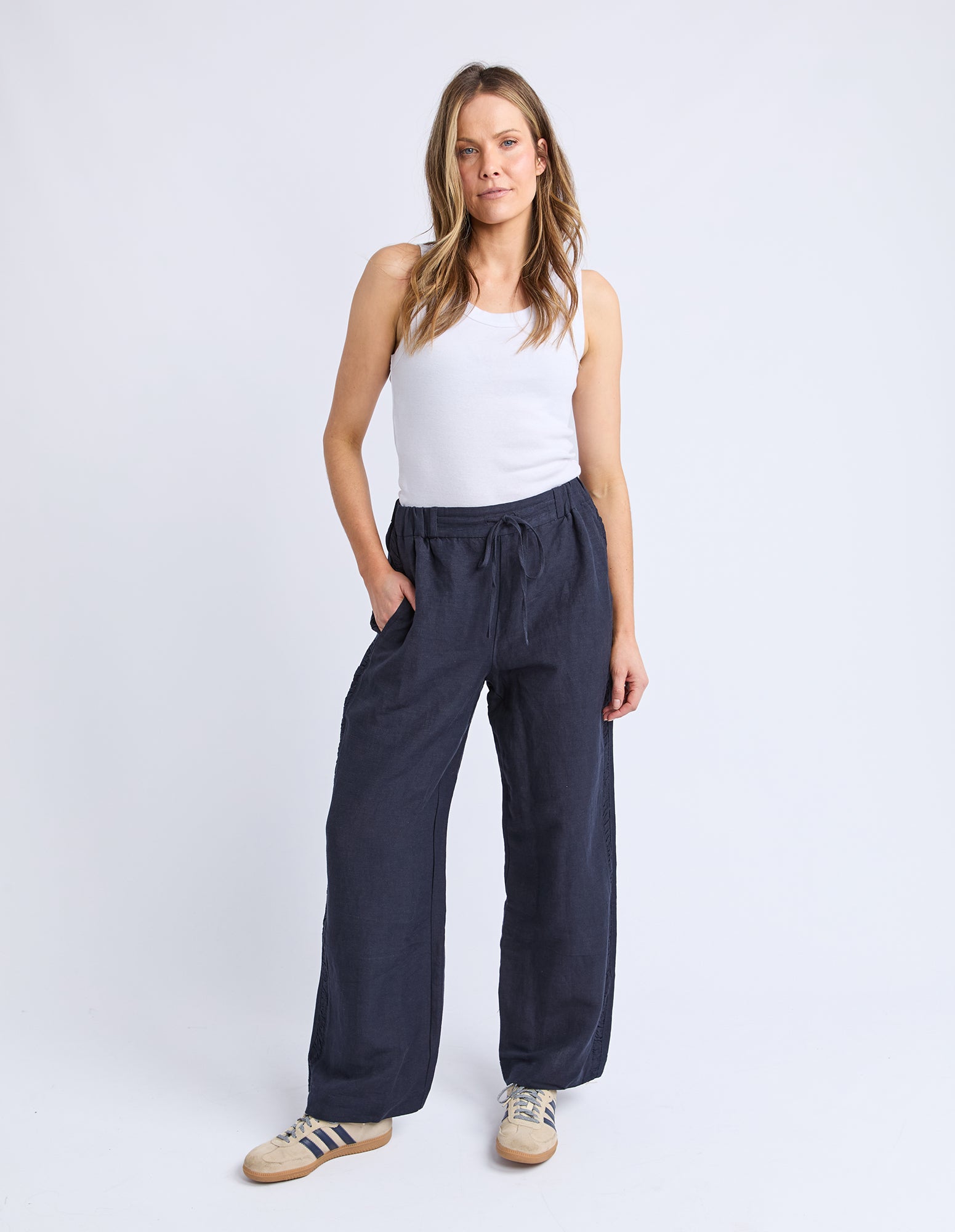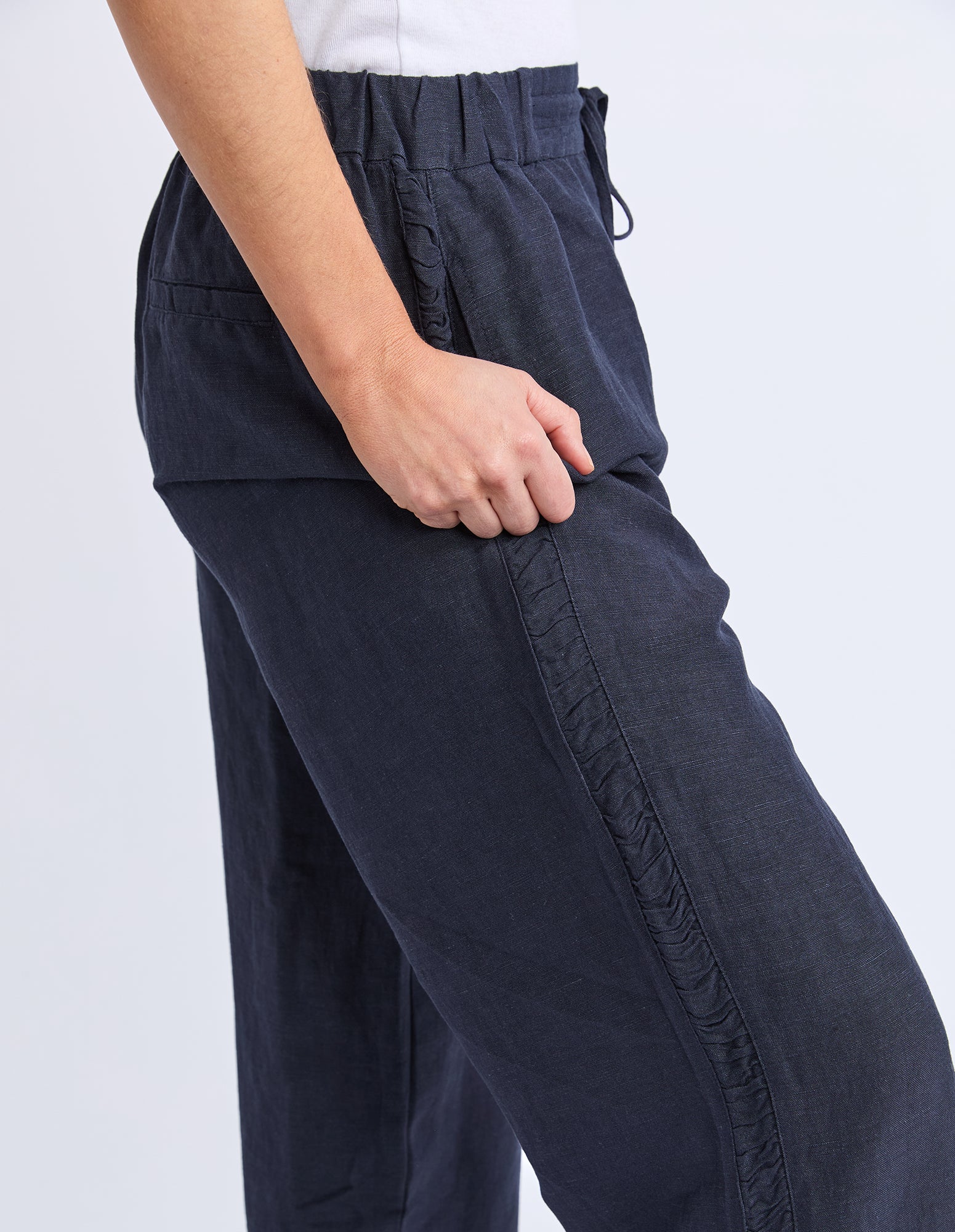 Designed for effortless style, the South Pant is made from breathable linen for ultimate comfort. These black slacks feature an elastic waist with a drawcord for a customizable fit, along with side pockets and subtle side detailing.