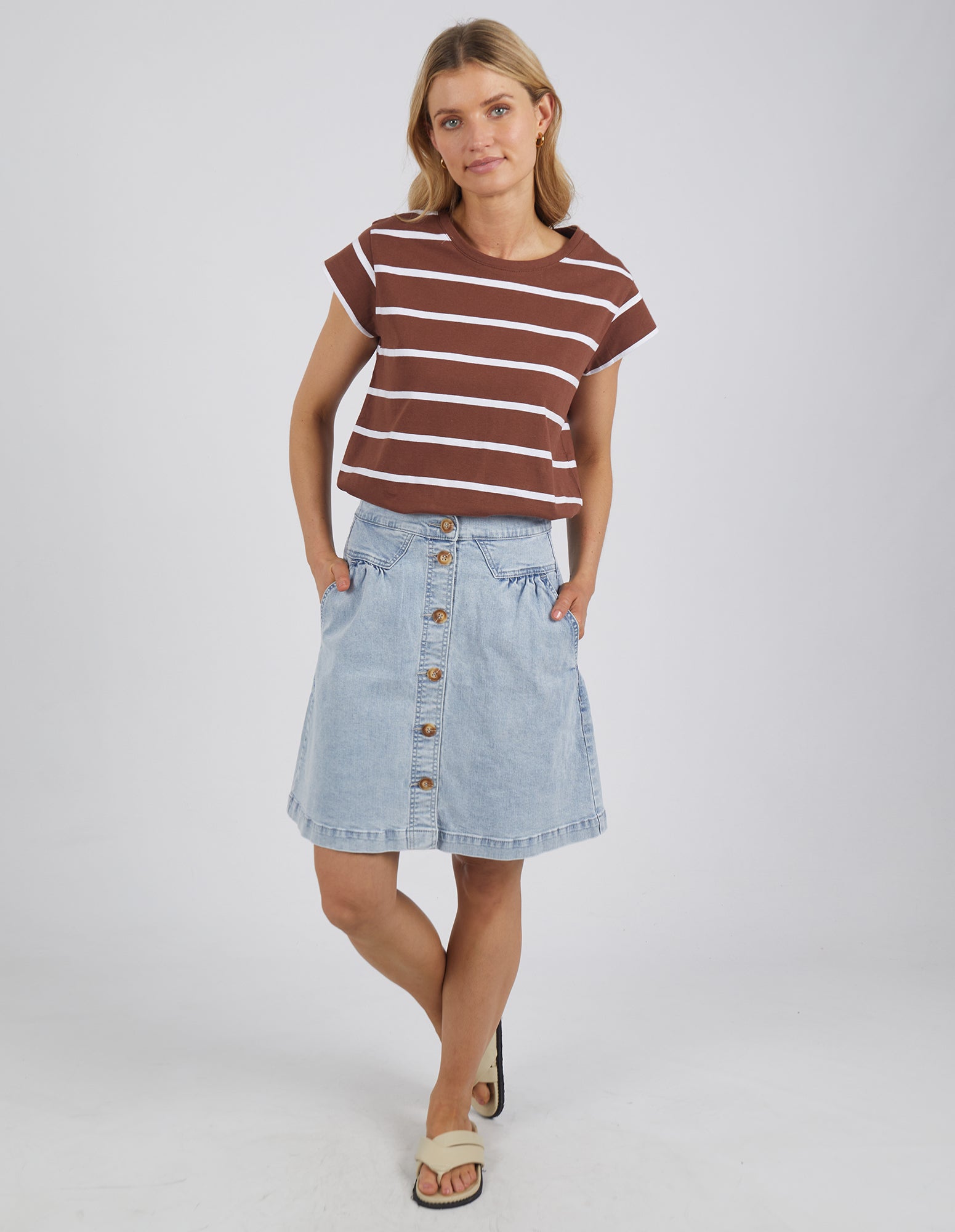 A little bit retro. A lot of cute. This A-Line denim button front skirt is a must-have this season. Featuring side pockets, front tuck detail and an elasticated back, this skirt looks great with strappy sandals and your favourite tee!