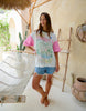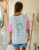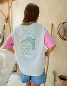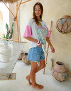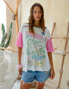 Go a little bananas in the best way. The Bananas Bahamas Tee brings all the island energy with pastel palms, dolphins and tropical vibes that feel straight out of a vintage postcard. With a soft washed finish, relaxed fit and pink contrast sleeves, this tee is made for salty hair, sunshine and trusting the universe. If you love the oversized look, stick with your regular size. If you are wanting a more relaxed fit, we recommend sizing down by 1 or 2 sizes.