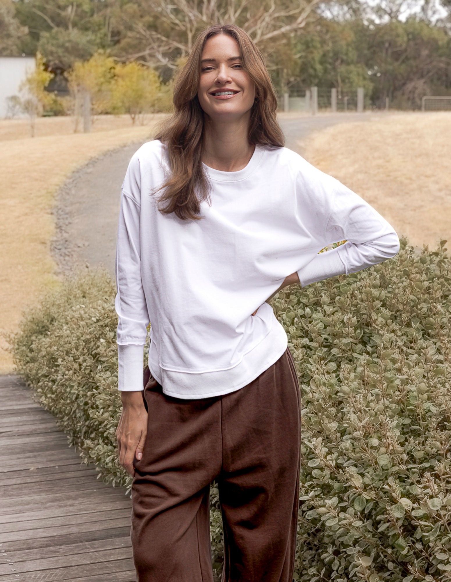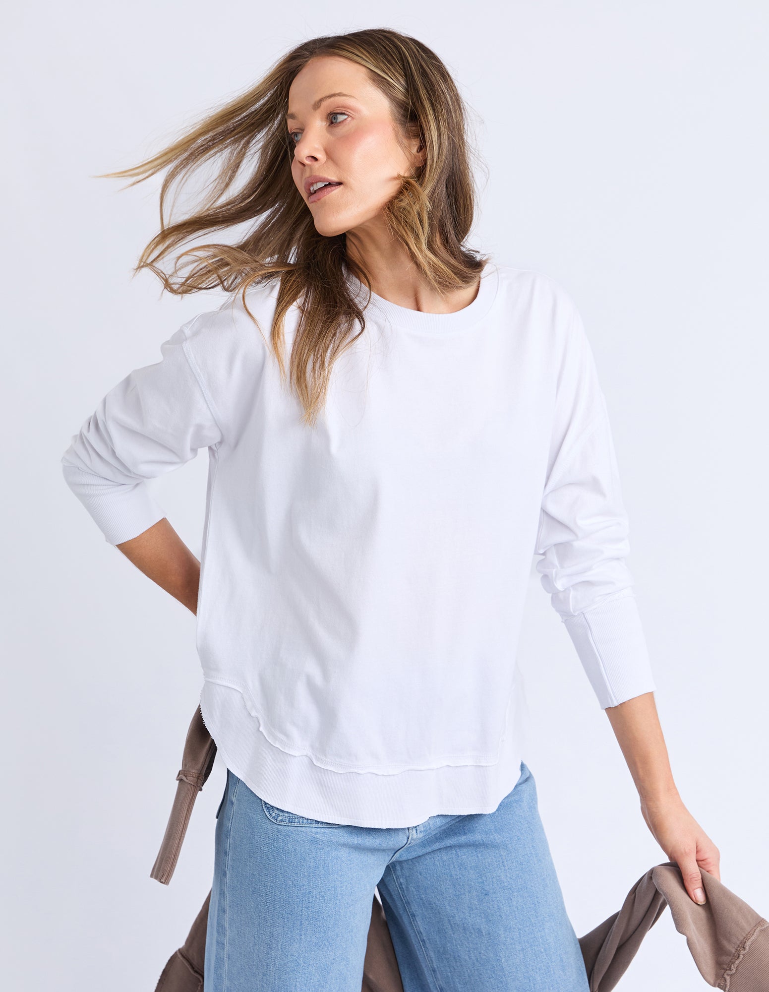 A new crew to the Foxwood range the Farrah Long Sleeve in 100% Fresh Pima Cotton features a classic crew neckline and raw edge detail. This relaxed fit jumper is an easy everyday wear.
