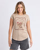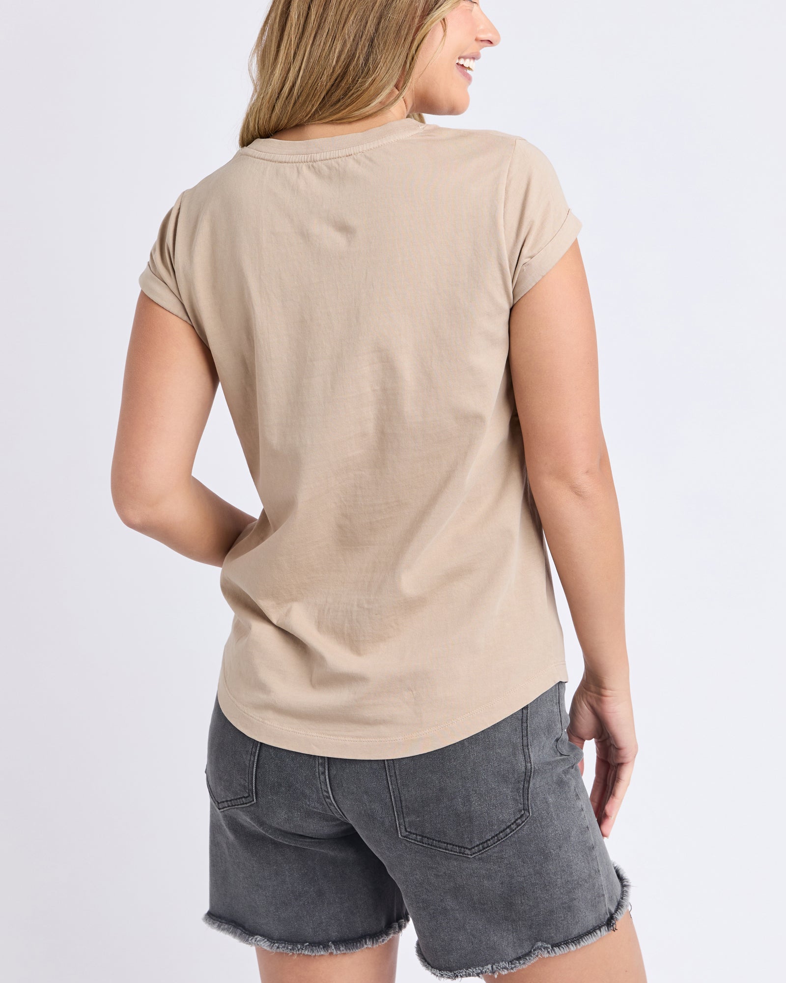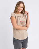 Bring a relaxed sense of style to your everyday look with the Florence Tee. Crafted from soft cotton, this tee offers lasting comfort and a classic feel. The warm neutral colour pairs easily with denim or shorts, while the vintage-style print adds a creative touch. Designed with a cuffed sleeve, curved hem, and round neck, it’s perfect for casual days with a touch of character.