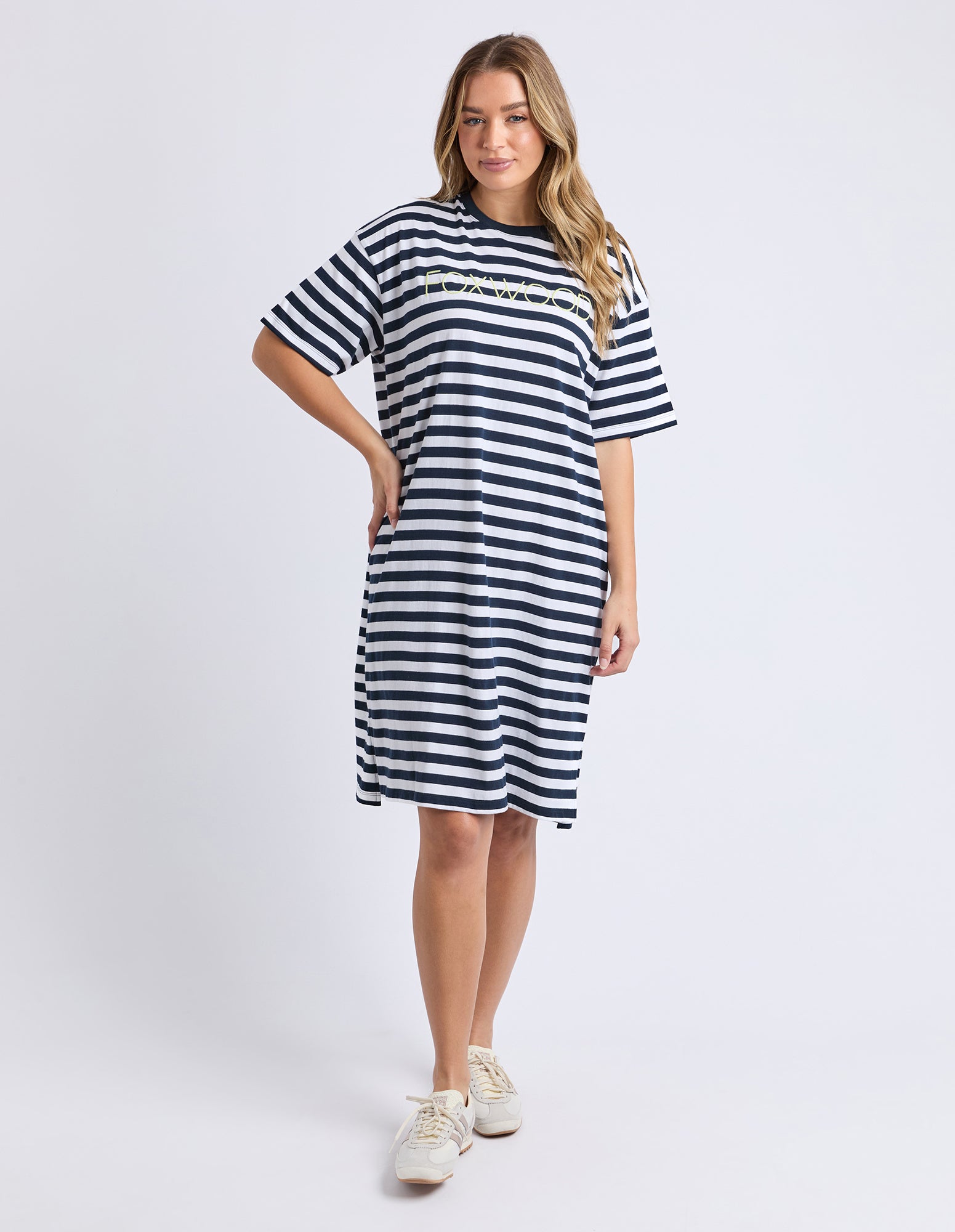 The Simplified Stripe Tee Dress brings a fresh, nautical feel to everyday dressing. Featuring bold yarn-dyed stripes, a Foxwood logo print, and a relaxed oversized fit, it’s made for comfort with a cool edge. Just add sneakers or slides for an easy-going look that’s ready for anything.